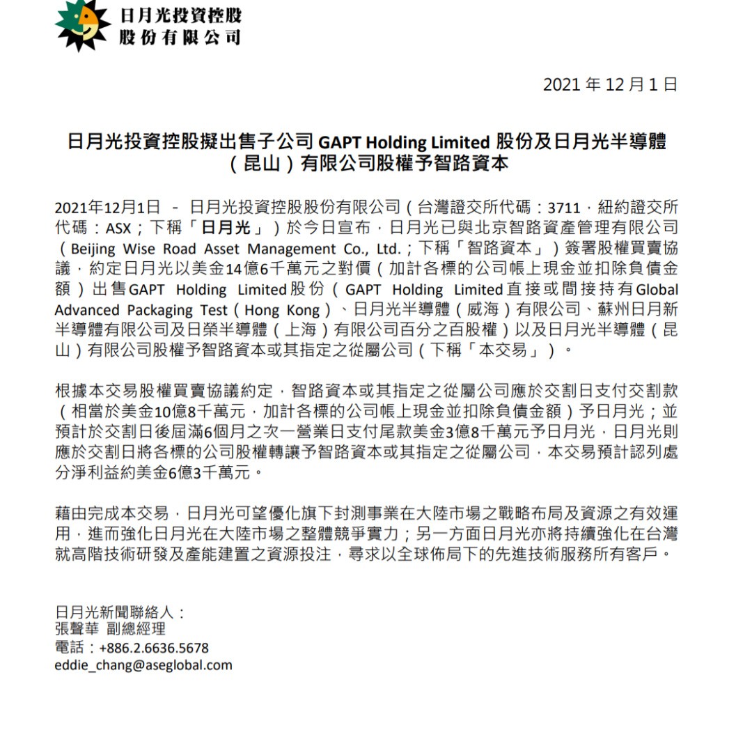 约定日月光以14.6亿美元对价,并加计各标的公司帐上现金并扣除负债金额,出售GAPT Holding Limited股份及直接或间接持有Global Advanced Packaging Test(Hong Kong)、日月光半导体(威海)有限公司、苏州日月新半导体有限公司及日荣半导体(上海)有限公司百分之百股权),以及日月光半导体(昆山)有限公司股权予智路资本或其指定之从属公司。