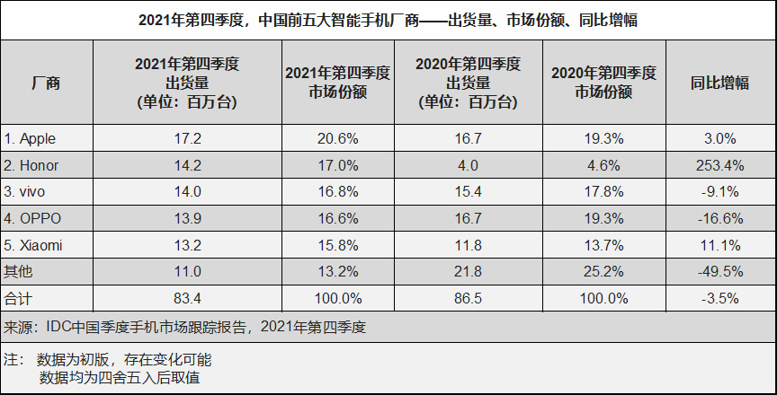 2021年第四季度及全年前五大智能手机厂商市场表现: