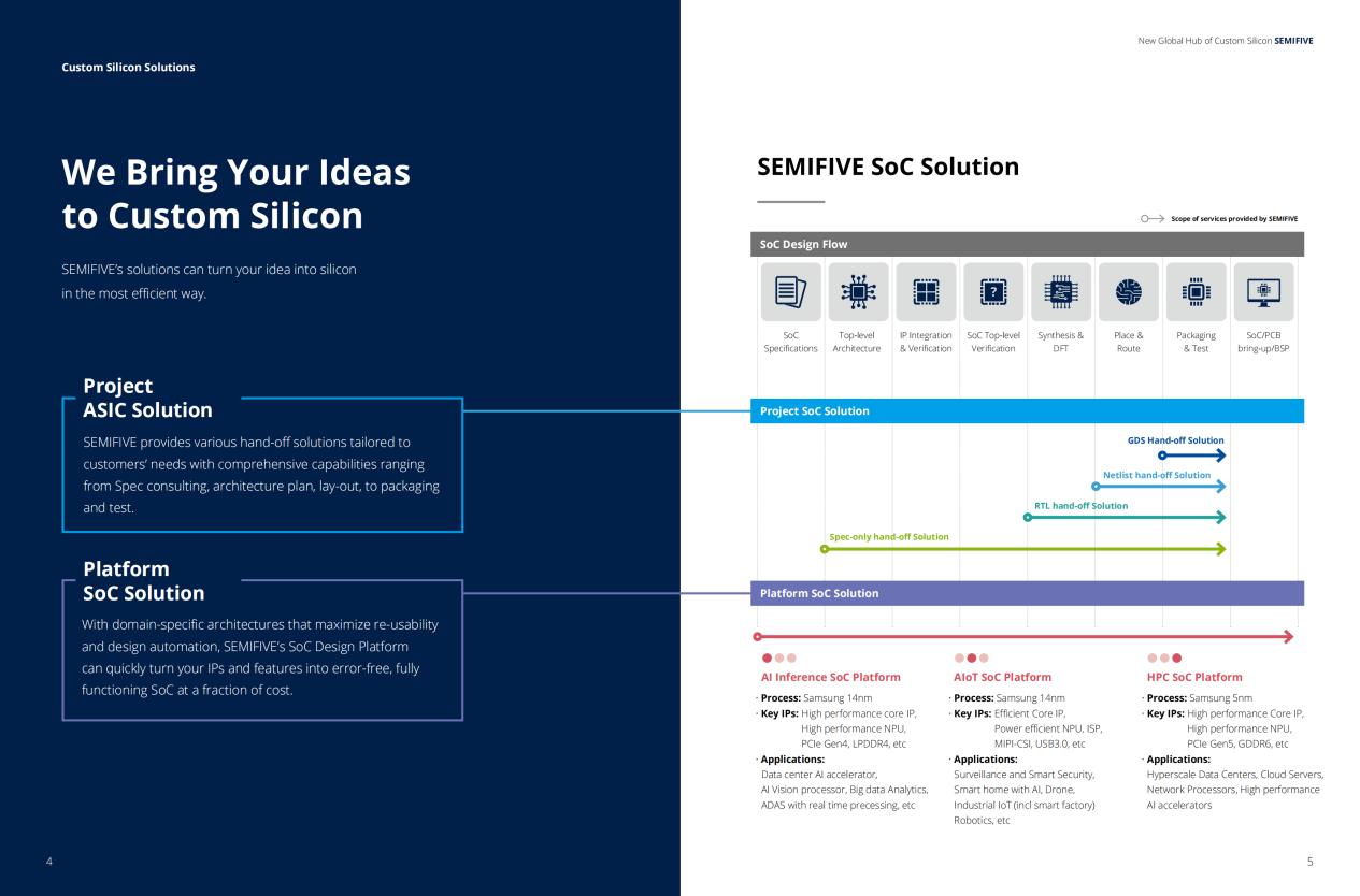 Founded in Seoul in 2019, SEMIFIVE is basing its foundation on Korea’s semiconductor design competency that was amassed for more than 20 years. With expertise in front-end to back-end design, SEMIFIVE has become the fastest growing silicon design company that offers the most comprehensive design solutions. SEMIFIVE’s core business is its innovative SoC Platform that enables low-cost & high-efficiency SoC design, and also provides various design solutions for global customers through its diverse network. As the cost of developing an SoC and the demand for customized silicon continue to grow rapidly, SEMIFIVE’s SoC Platform will play a key role in turning innovative ideas into silicon.